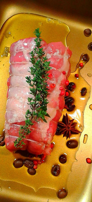 Arrosto di maiale, con essenza di caffè e spunti di anice e timo.